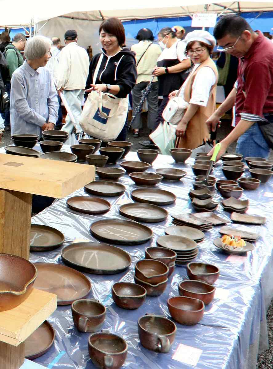 People examine Bizen ware pieces at outdoor stalls in the center area of Bizen in October last year. The event has been held every autumn for the past 40 years to promote Bizen ware.
