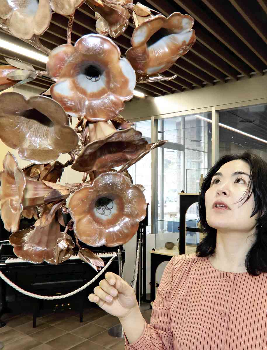 Miyako Tatsu, 42, who moved to Bizen after surviving the Noto Peninsula Earthquake in January last year, exhibited a chandelier-like piece with several trumpet-like objects attached.