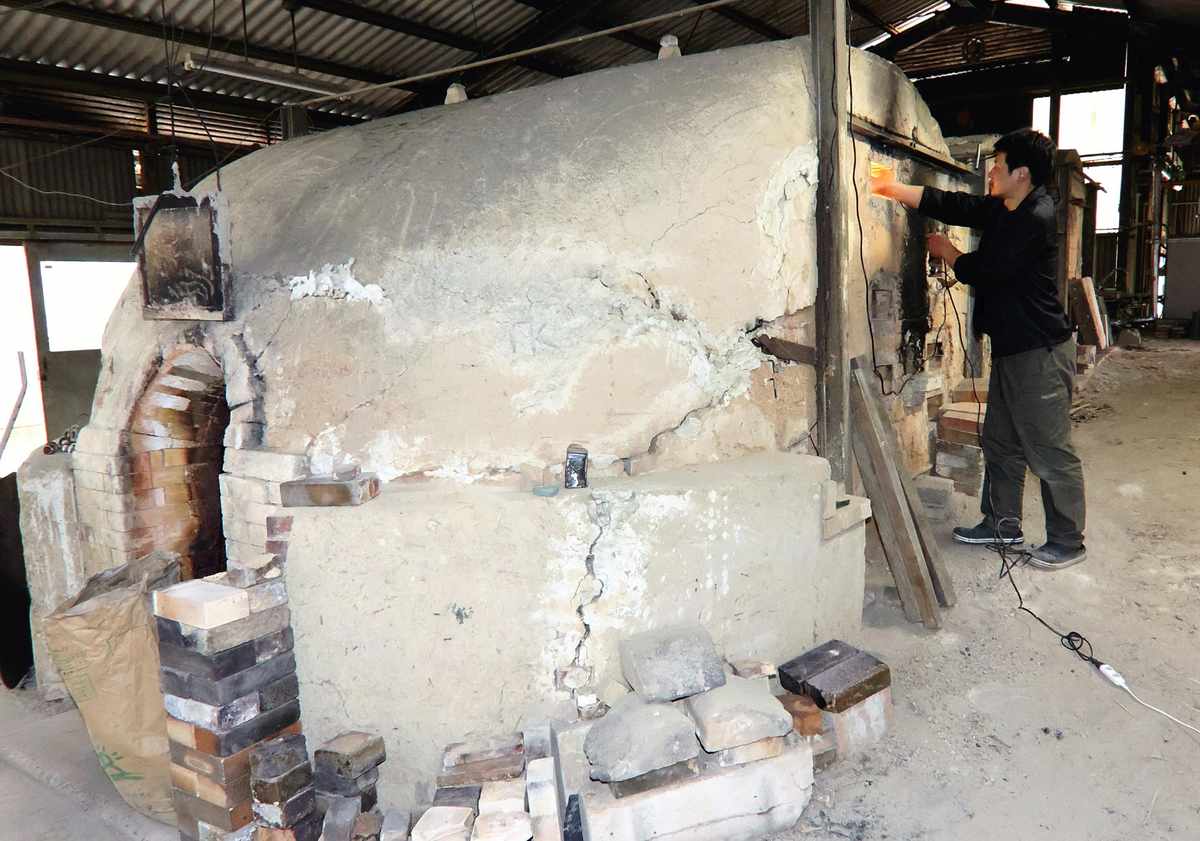 Fujimori inspects the climbing kiln inside the Bizen Togei Center.