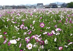 Millions of Cosmos Bloom in Historic Site in Nara Pref., Visitors Take in Mountain View Behind Beautiful Flowers