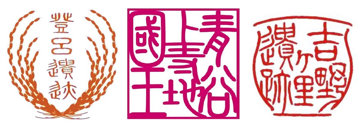 From left: The goshuin stamp of the Toro ruins in Shizuoka, incorporating rice plants in its design; that of the Aoya Kamijichi ruins in Tottori, like an ancient seal; that of the Yoshinogari ruins in Saga Prefecture, based on the image of a clay burial jar