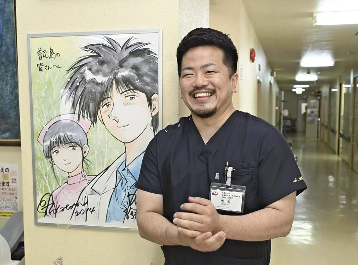 Shin Hashino smiles at Shimokoshiki Clinic on Shimokoshiki Island, Kagoshima Prefecture, on April 16. To his left is an illustration donated by the author of “Dr. Coto’s Clinic.”