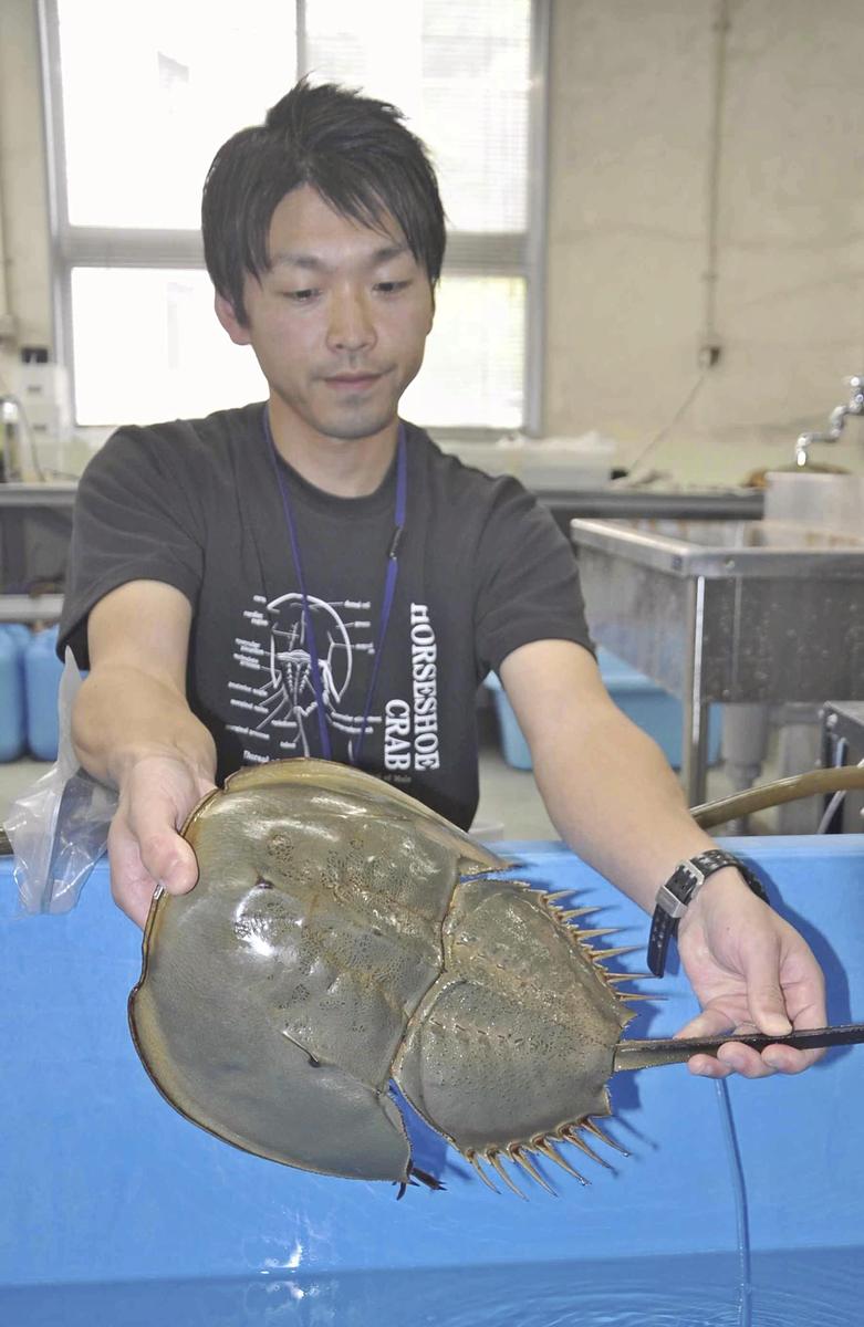 Satoshi Morinobu, head of the Kasaoka Horseshoe Crab Museum, holds a horseshoe crab.