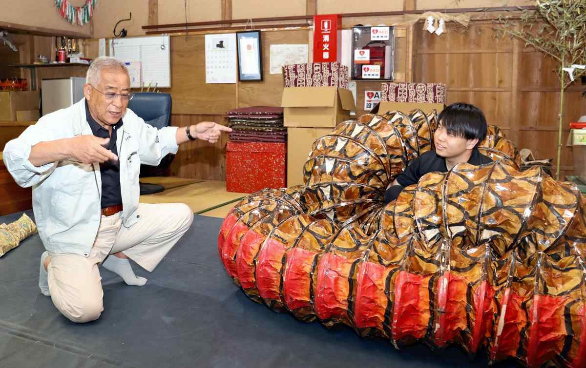 Issei Fujino, right, practices operating a serpent body in Hamada, Shimane Prefecture, while receiving advice from Katsuyuki Kametani about dance techniques and mindset.