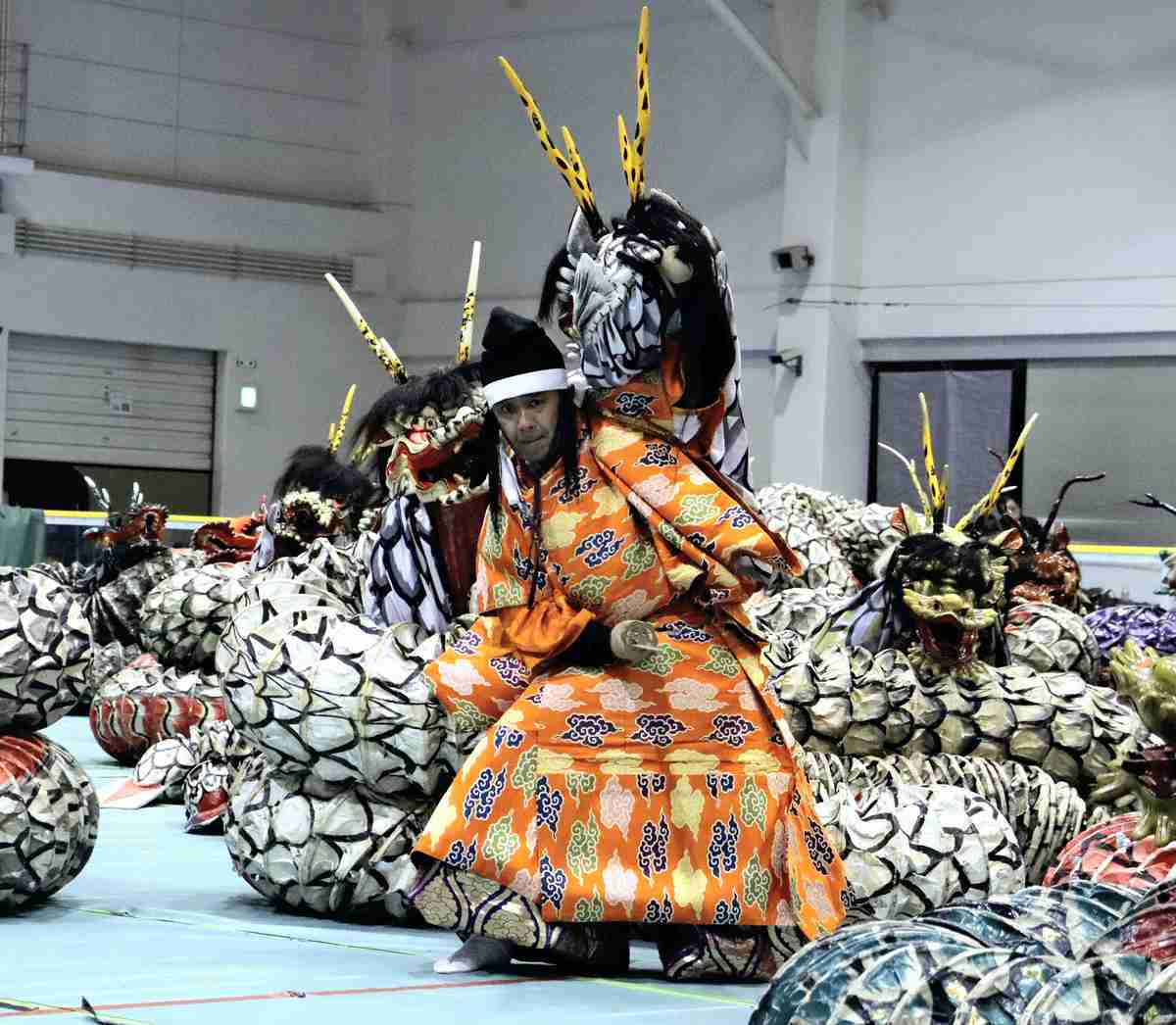 One day in early June, about 100 people gathered at a skating rink in Hamada. Accompanied by large and small drums and flutes, performers did a full rehearsal of the four plays to be performed at the Expo, including “Orochi.”