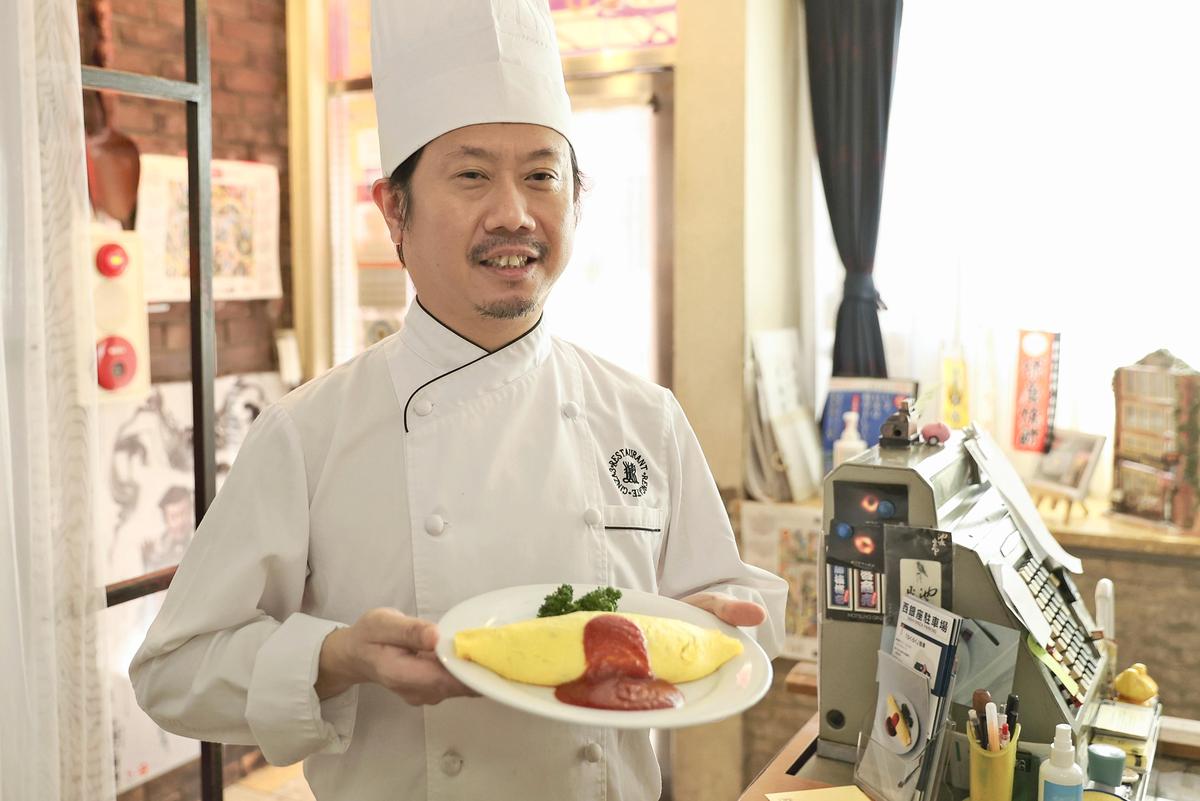 Masahisa Nakamura holds a plate of omurice beside an antique cash register.