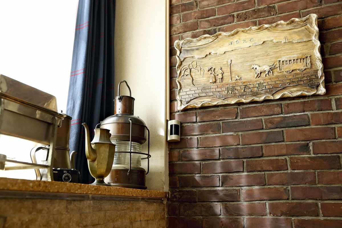 Bricks from the original Meiji-era Rengatei building are used in a part of the interior wall.