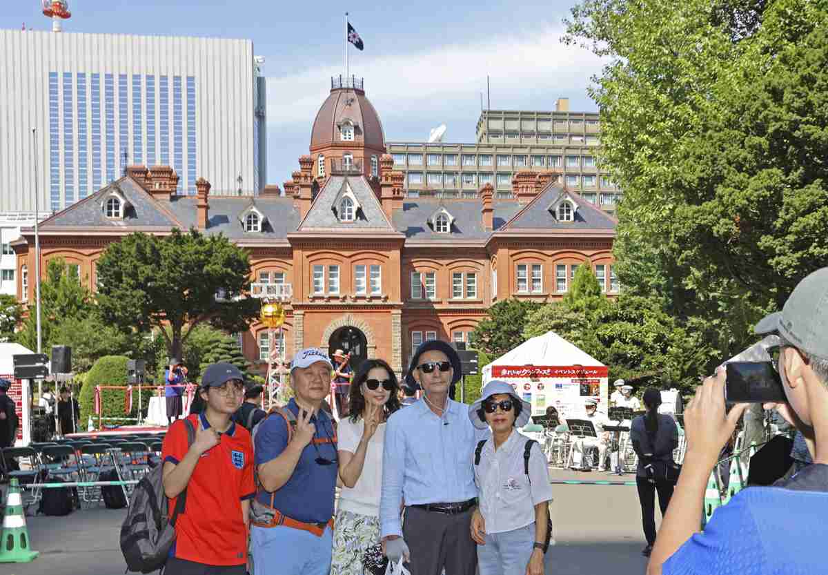 People pose for a photo in front of the Red Brick Office in Sapporo on Friday.