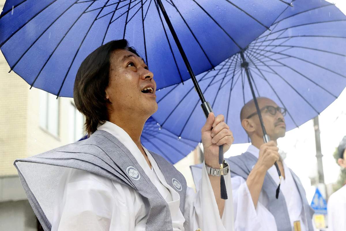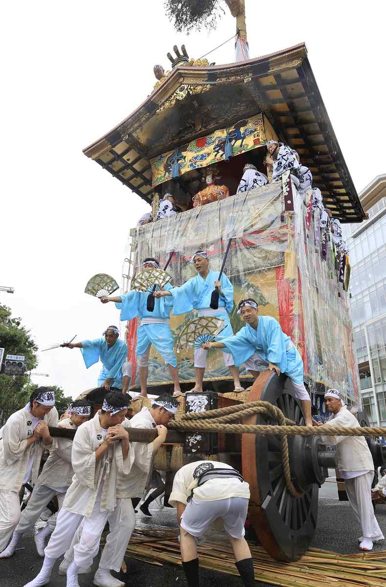 On July 17, the Niwatori Hoko began to move forward amid unusually heavy rain. Dressed in kamishimo traditional attire, Sakamoto led the float, turning repeatedly to check that it was proceeding smoothly. He sometimes walked slowly and got beside the wheels.
