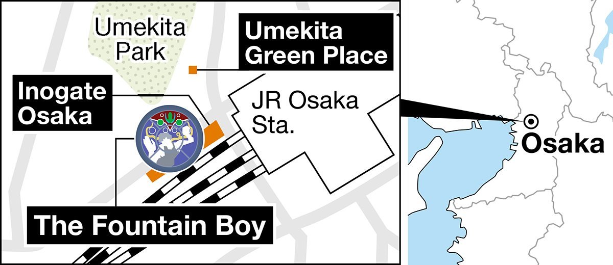 The piece was installed on the first floor of Inogate Osaka, a complex building connected to the station, in July 2024 to coincide with the building’s opening.