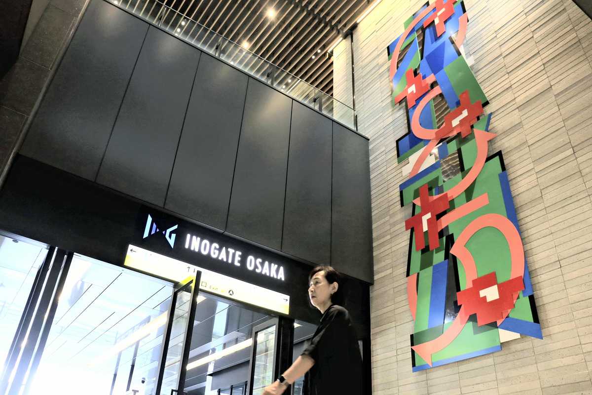 “Point,” a 2-meter-wide, 7-meter-high graphic artwork, is hung on a wall on the first floor of Inogate Osaka. The image of a bustling station where people and objects interact is depicted in the artwork by laying multicolored symbols on top of each other.