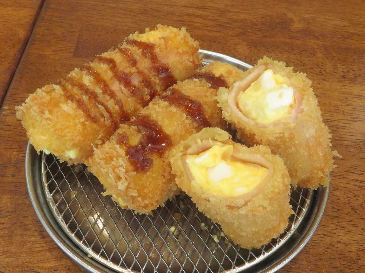 This innovative dish features a fluffy egg salad wrapped in ham and fried into a cutlet. Besides the “plain” egg salad, you can enjoy eight varieties, including “tuna corn” and “cheese.”