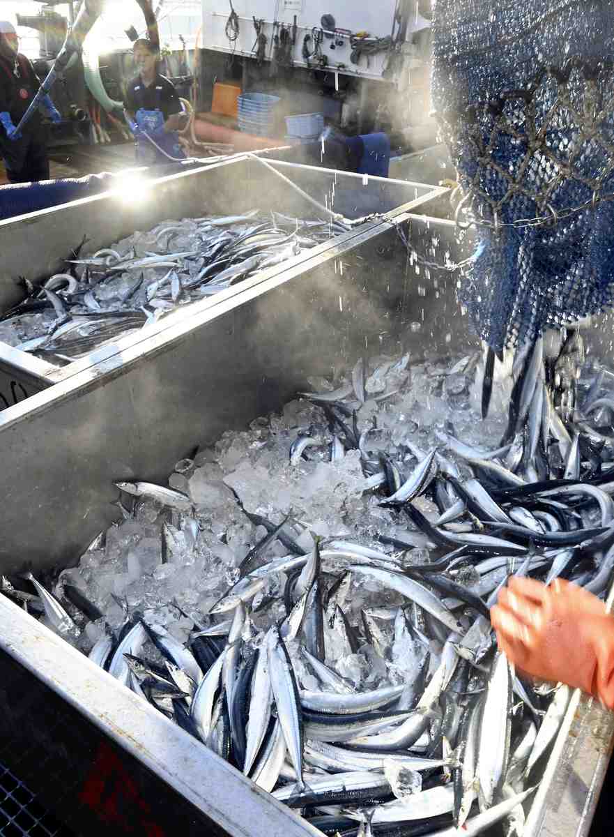 Three medium-sized boats set out on Aug. 10 and caught the saury in the North Pacific Ocean, about 1,300 kilometers away. Kenji Endo, a 58-year-old fishing master, said, “The fishing grounds are far away and the schools are sparse, but the size is good for the early season, so we are optimistic.”