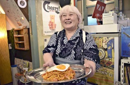 Yasuyo Takahashi carries a plate of naporitan topped with a sunny-side-up egg.