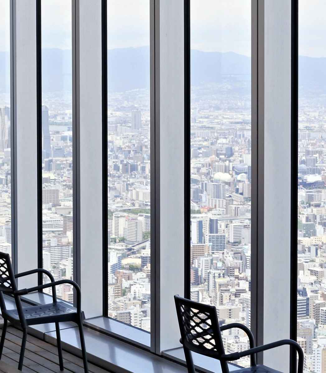When you look down from the observation deck, you can see roads intersecting in all directions and railways running back and forth. Buildings of varying heights can be seen sprawling across the neighborhood. Far off to the west, you can see Mt. Rokko in Kobe and the Akashi-Kaikyo Bridge across the Seto Inland Sea. To the east is a view of Mt. Ikoma in Nara Prefecture.
