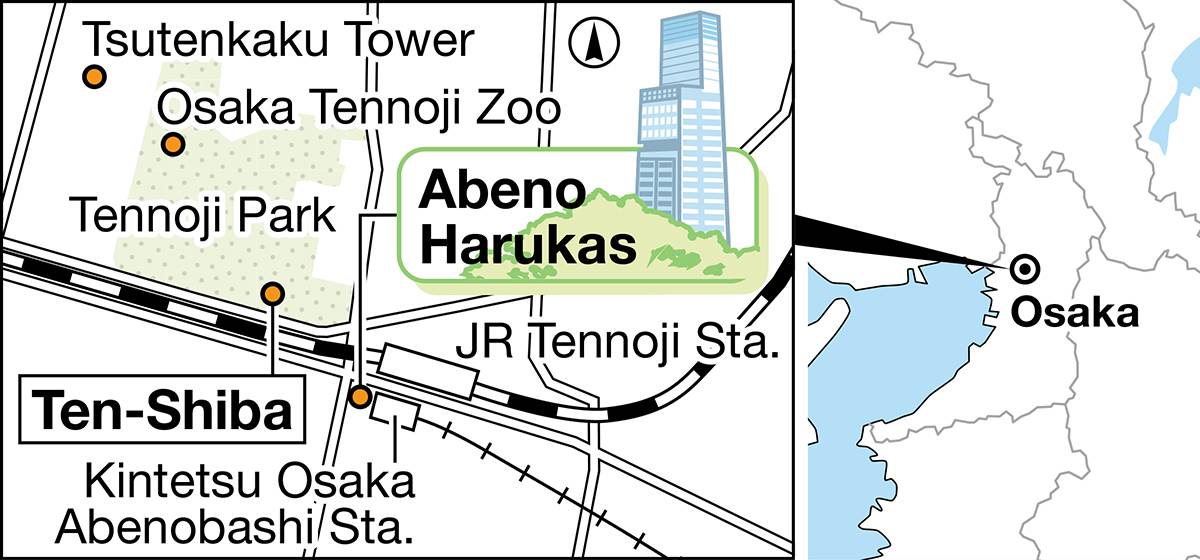 Ten-Shiba is an open space at the foot of Abeno Harukas. It is located next to the premier transportation hub in southern Osaka, giving it direct access to Kansai Airport.