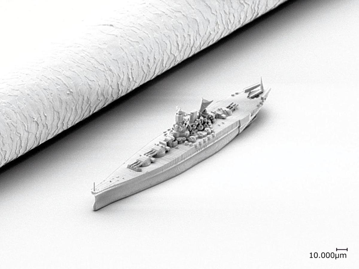 The 1:1 million scale model of the Yamato is small enough to sit on a strand of hair