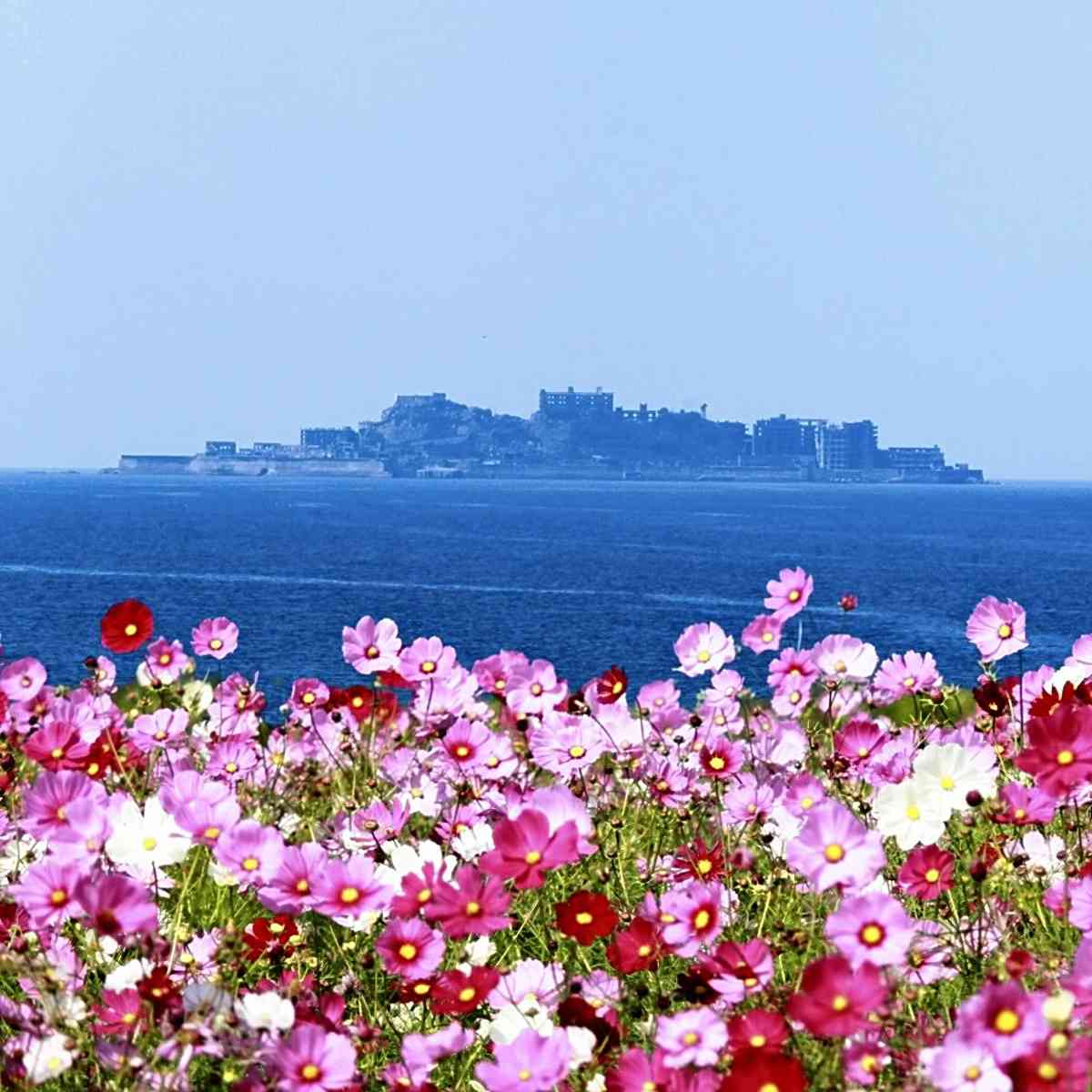 NAGASAKI — A project is underway to create a cosmos field on a hill in Nagasaki where Hashima Island, also known as Gunkanjima Island — an island that once thrived from coal mining — can be seen.