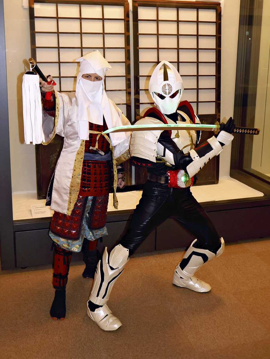 The W Gyobu superheroes — Otani Yoshitsugu, left, and Socho no Gyobu — in Tsuruga, Fukui Prefecture