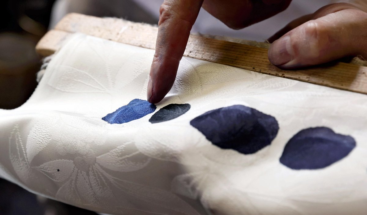 KYOTO — The swish of brush strokes filled the quiet workshop, reminiscent of a rustling dress. Artisan Satoshi Furuhashi was applying liquid dye to a cloth with a deer-hair brush. Sometimes he would use a different side of the brush, flipping it around.