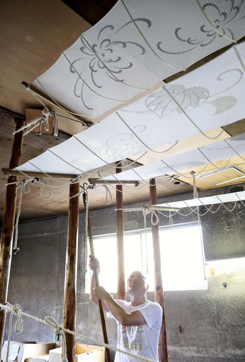 Strips of tanmono cloth are fixed to Japanese cedar pillars and stretched out.