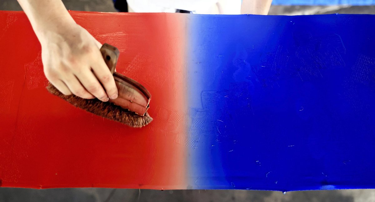 Brush dyeing artisan Satoshi Furuhashi applies red and blue dyes to a cloth, leaving a white space in between, in Minami Ward, Kyoto.