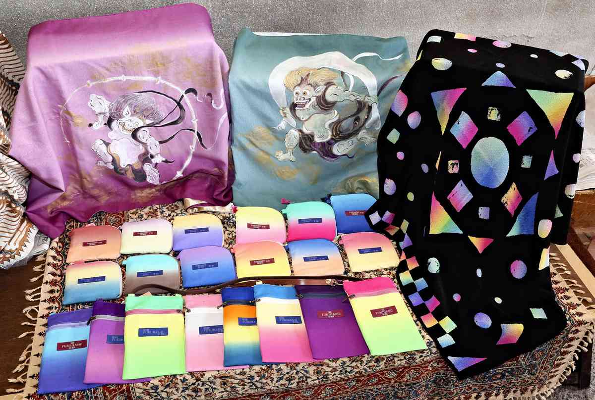 Smartphone cases, furoshiki wrapping cloths and other items that have been prepared with the bokashi technique