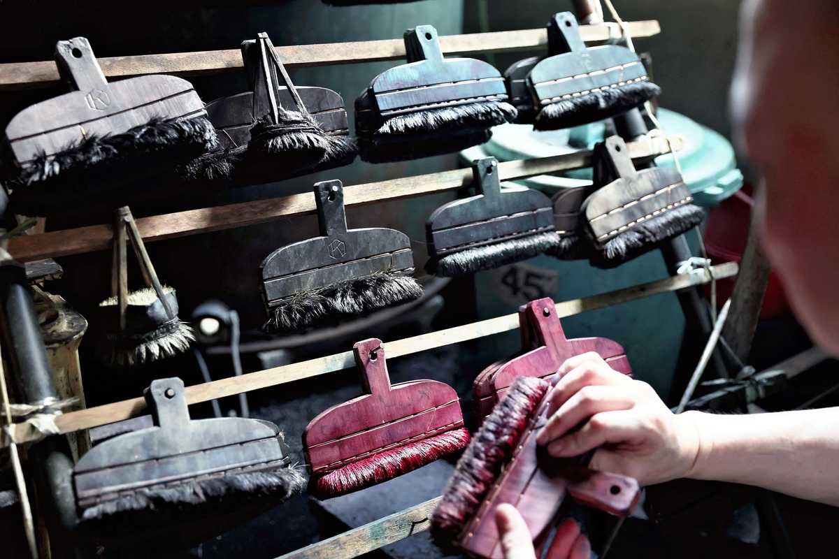 The workshop uses more than 100 brushes of various sizes, employed according to dye color and intensity.