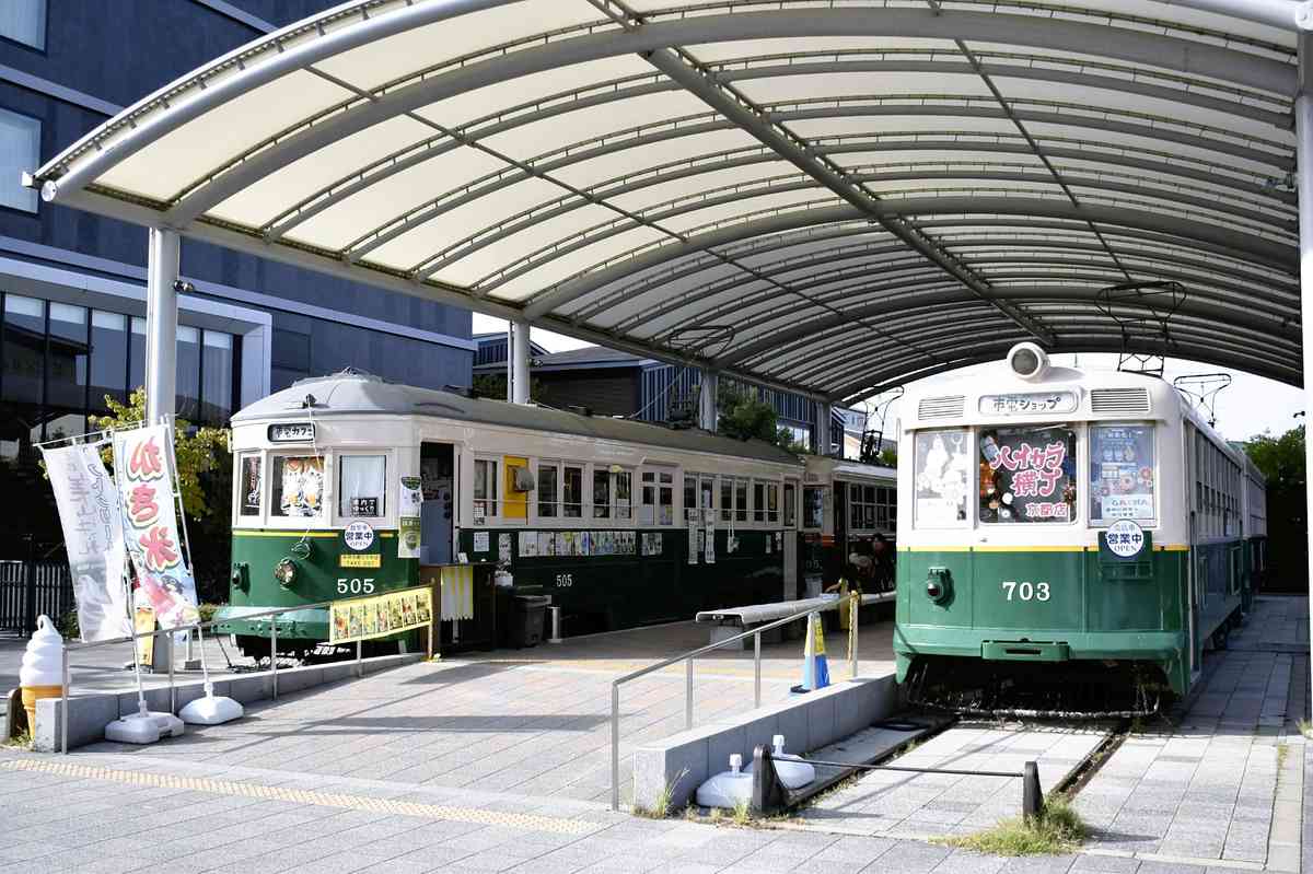 At their peak, 17 streetcar lines crisscrossed the city, but all were discontinued by 1978. Four cars that actually ran in the city are on display side by side at the Shiden Hiroba (Street car square) in Umekoji Park, with each car serving as a cafe, souvenir shop and rest area.