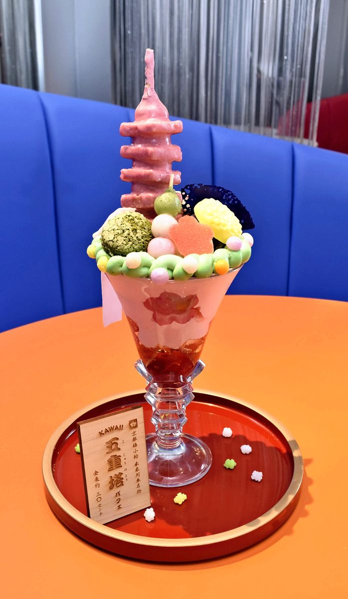 The about 30-centimeter-tall “Goju no to Parfait” (Five-Story Pagoda Parfait; ¥2,600 including tax) is an eye-catching menu item filled with Japanese sweets such as wheat gluten cakes and rice powder dumplings in addition to Western-style cakes and ice cream.