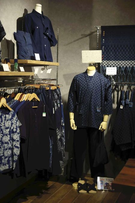 A store owned by Nogawa Senshoku Kogyo near the head office sells indigo-dyed goods.