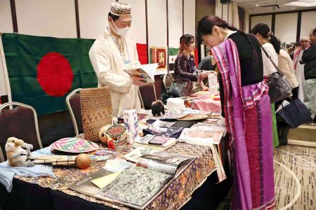 Booths were set up at the venue to introduce the culture and livelihoods of 18 countries the former participants were dispatched to. A talk was also held following the ceremony.