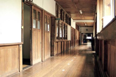 A long corridor in the former Yuya Elementary School