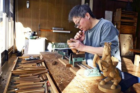 Hitoshi Takata works on a horse carving in Nanto, Toyama Prefecture.