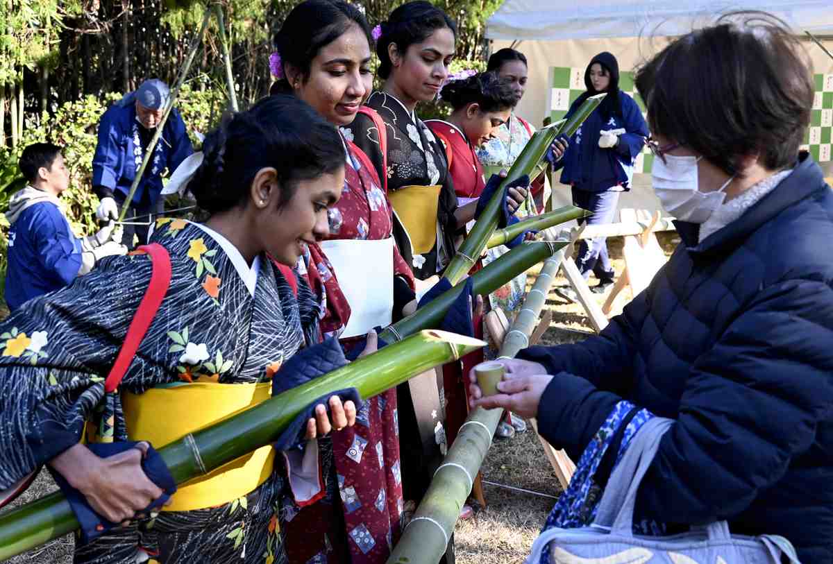 In the temple’s main hall, monks performed prayers to ward off cancer. At the same time, local vocational students, including international students from Sri Lanka and Myanmar, served as sasamusume, pouring warmed sake or water from about 1-meter-long pieces of green bamboo into bamboo cups held out by visitors who then slowly savored the drink.