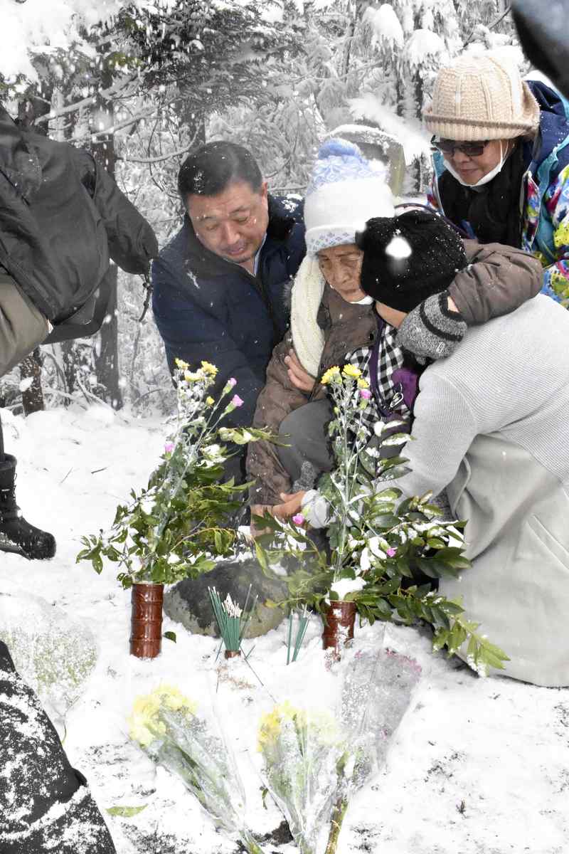 Rosalina Kamba, center, places her hand on her father’s gravestone while supported by her daughters in Hoki, Tottori Prefecture.