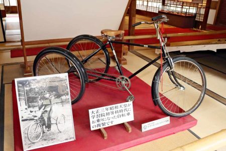 Inside the annex, chairs and dining tables used in those days, pictures drawn by Emperor Showa and a chanchanko jacket he wore are on display, as well as an eye-catching replica of his adult tricycle.