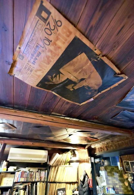 A rare poster commemorating a Bill Evans show in Japan is stuck to the ceiling.