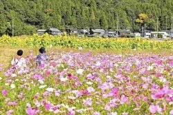 Millions of Cosmos Bloom in Historic Site in Nara Pref., Visitors Take in Mountain View Behind Beautiful Flowers