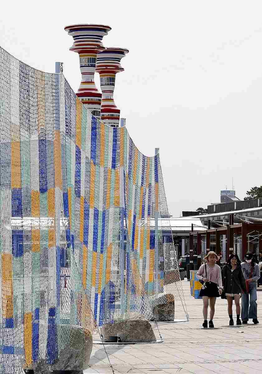 At Takamatsu Port in Takamatsu, visitors were captivated by “Sora-Ami: Knitting the Sky,” a four-meter-high, 32-meter-wide work by artist Yasuaki Igarashi using interwoven brightly colored fishing nets.