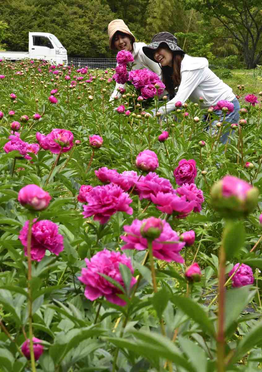 Visitors to a farm in Gose, Nara Prefecture, can pay to pick peony flowers and take them home, as the plants are being cultivated for medicinal purposes and the flowers are not needed.