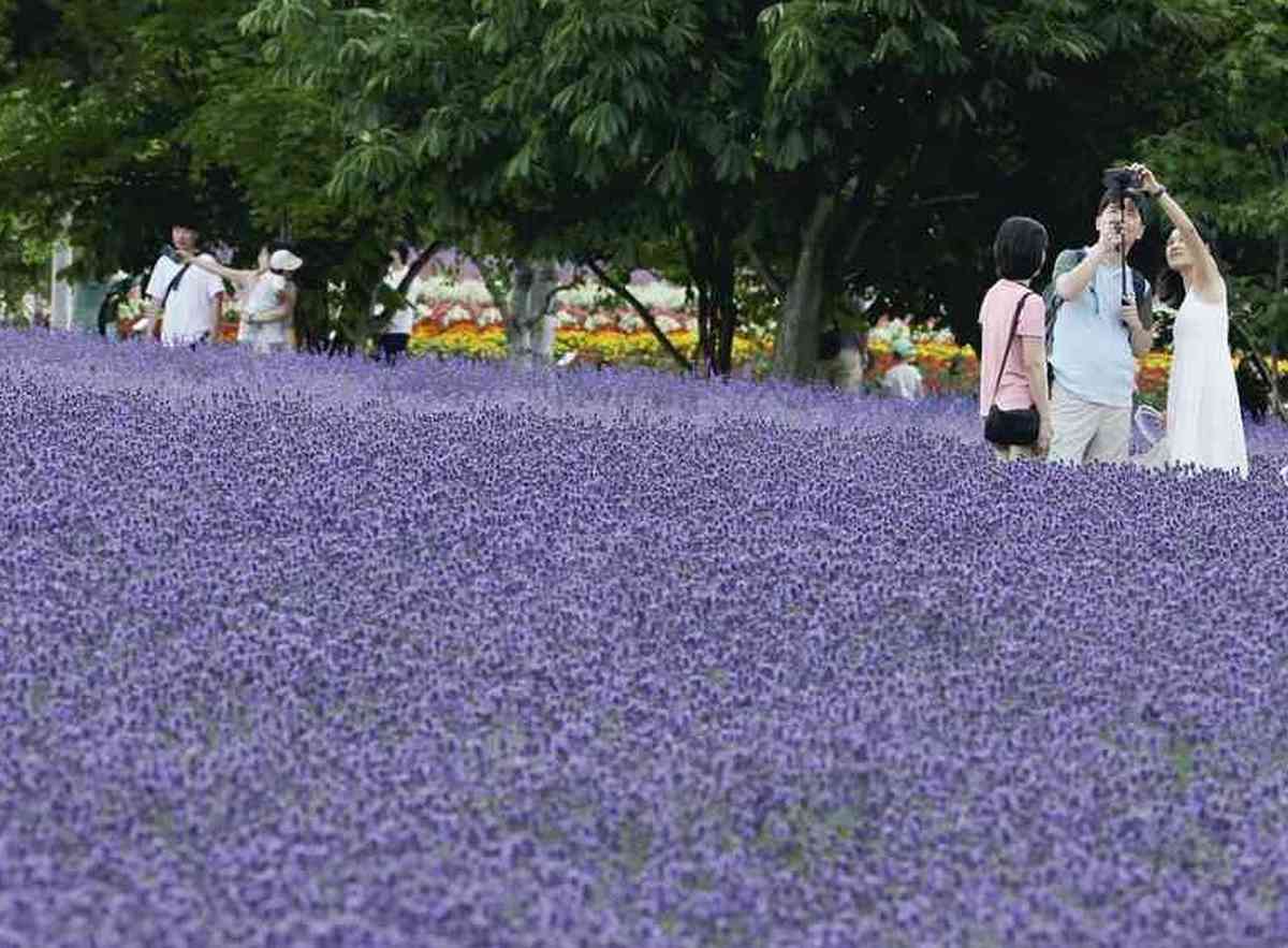 Vibrant purple lavender blossoms entice visitors to take pictures at Farm Tomita in Nakafurano, Hokkaido. This lavender field is one of the most famous in Hokkaido, with approximately 60,000 plants of five varieties covering a total area of approximately 5 hectares. Even on Tuesday, when a typhoon hit Hokkaido, the weather was calm here, 170 kilometers north of where the storm made landfall. A 55-year-old nurse visiting from Osaka Prefecture, said, “The colors and fragrance are so soothing.” The peak flowering period is expected to last until around July 20.
