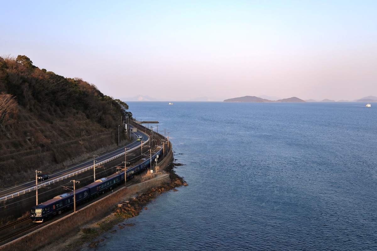 The West Express Ginga heads toward Shimonoseki with the Seto Inland Sea visible from the windows.