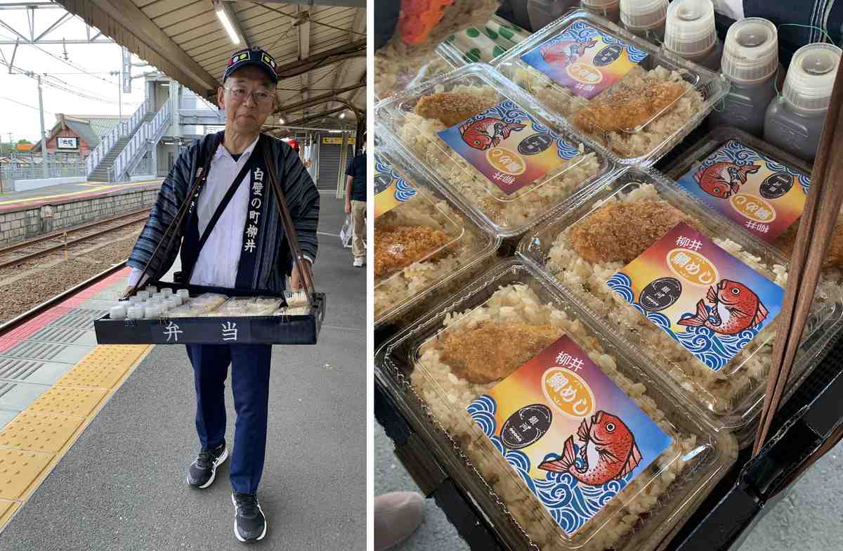 A vendor carries a tray of ekiben boxed meals on a platform at Yanai Station. He sells boxes of local specialty taimeshi seabream rice, right.