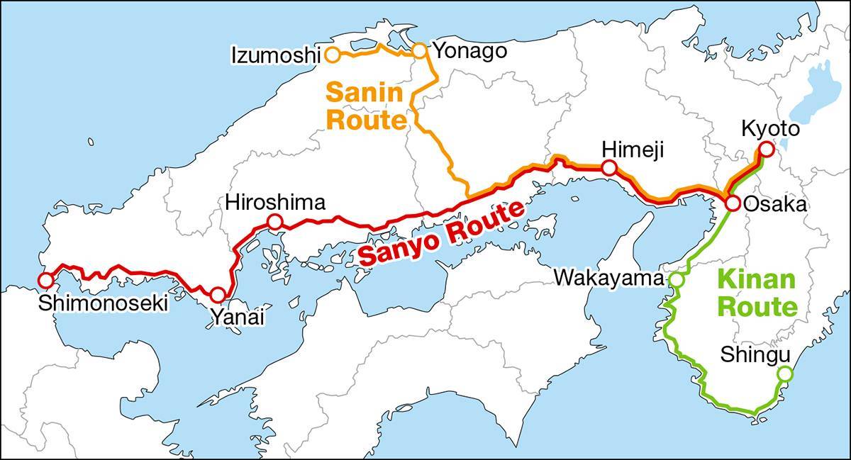 The Ginga operates on three main routes depending on the season in the Sanyo, Sanin and Kinan (Wakayama) regions. This year, the Sanyo route runs between Kyoto and Shimonoseki stations until Aug. 9, and the Kinan route between Kyoto and Shingu stations in Wakayama Prefecture from Aug. 25 to Oct. 29.