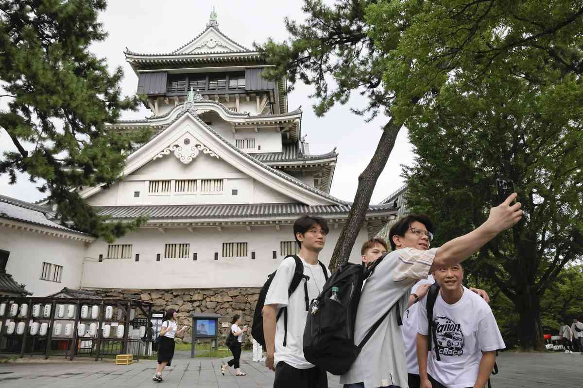 Tourists take photos with Kokura Castle in the background in Kitakyushu in September.