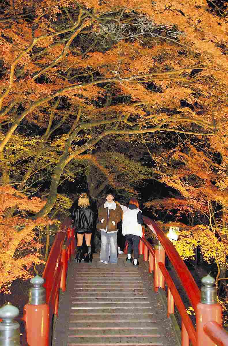 MAEBASHI — The autumn leaves are lit up near Kajika Bridge in Ikaho Onsen hot spring resort in Shibukawa, Gunma Prefecture, attracting many tourists at night.