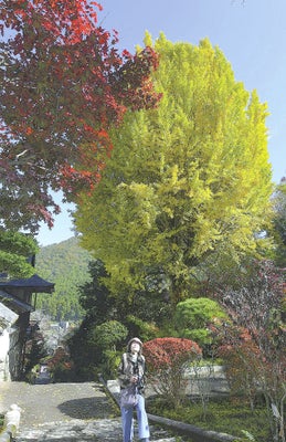 Meanwhile, in Tanba in the prefecture, the leaves of an over 20-meter-tall gingko tree have turned bright yellow, standing out among the red foliage of the Japanese maple trees at Joshoji temple.