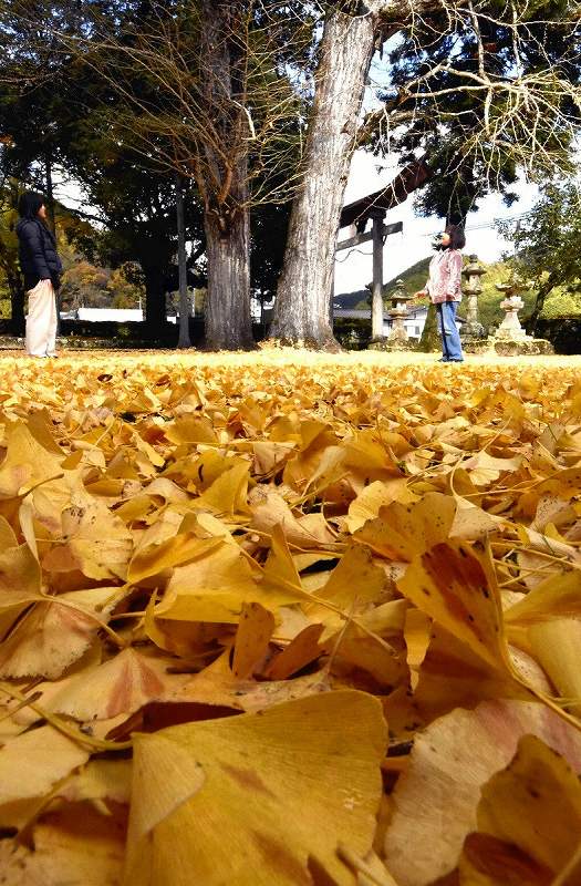The grounds of Otte Jinja shrine in Tanba-Sasayama, Hyogo Prefecture, are covered with fallen ginkgo leaves.