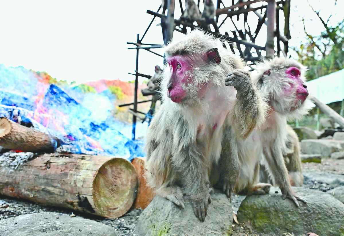 Yakushima macaques gather around a specially prepared fire to warm themselves at the Japan Monkey Centre in Inuyama, Aichi Prefecture, on Wednesday. The traditional winter event was shown to the press before it opens to the public on the winter solstice on Monday. The annual event originated in 1959 during the Isewan typhoon, when staff burned driftwood for warmth and a baby monkey came close. Apart from the winter solstice and the first three days of the New Year, the special fire is scheduled to be prepared on Saturdays, Sundays and national holidays until Jan. 31.